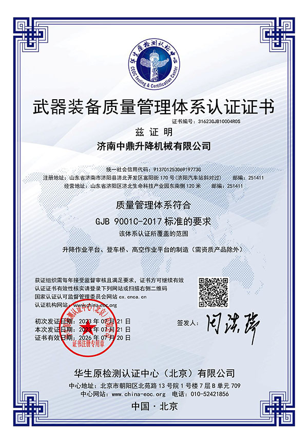 武器装备质量管理体系 - 公司资质 - 往复式提升机,大型AGV定制平台,剪叉式升降平台,移动式升降机,剪叉式液压升降机实力生产厂家:济南中鼎升降机械